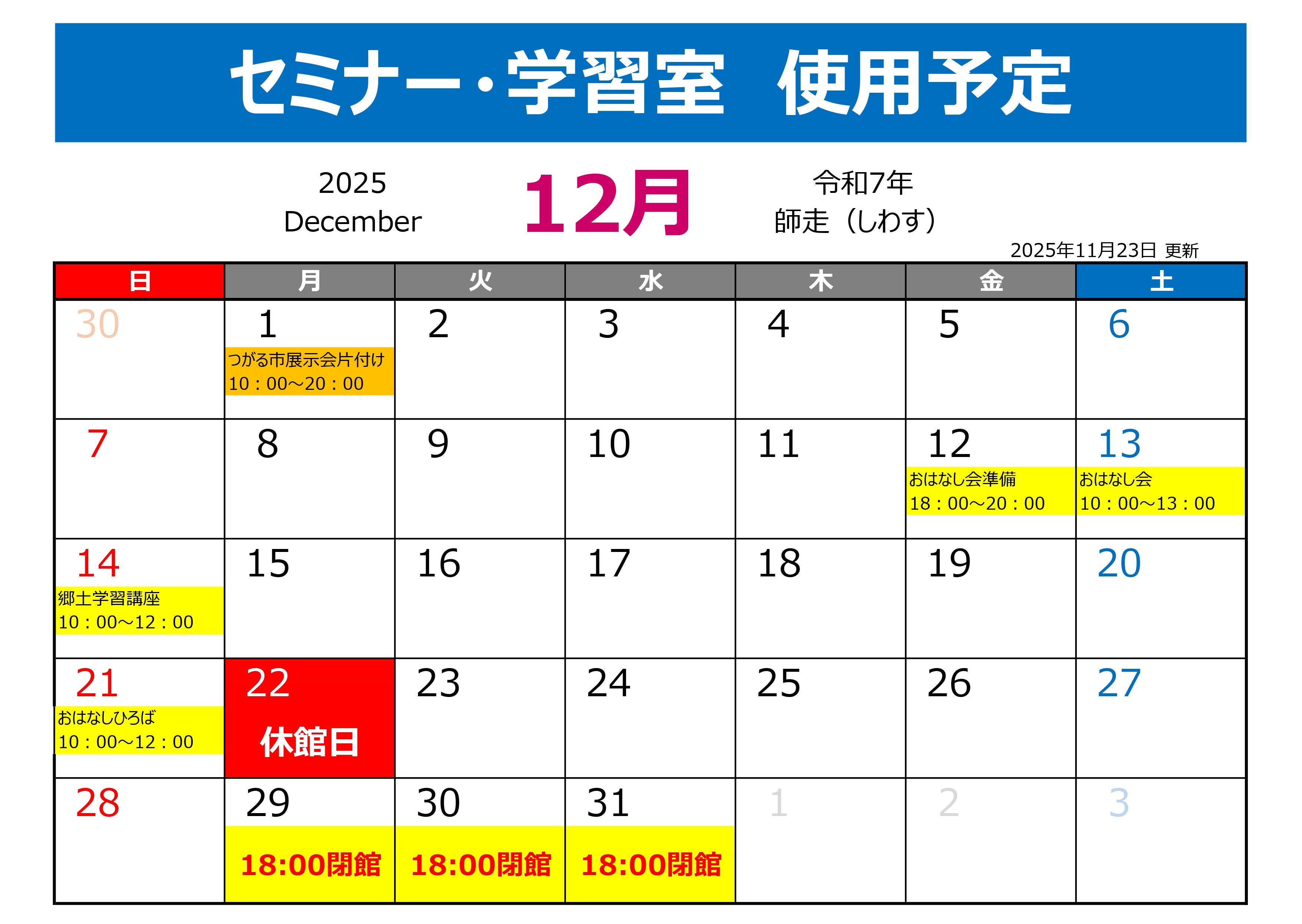 ・セミナー・学習室の開放状況は、下記の予定表より確認いただけます。予定が入っている時間帯はご利用いただけません。予めご了承ください。