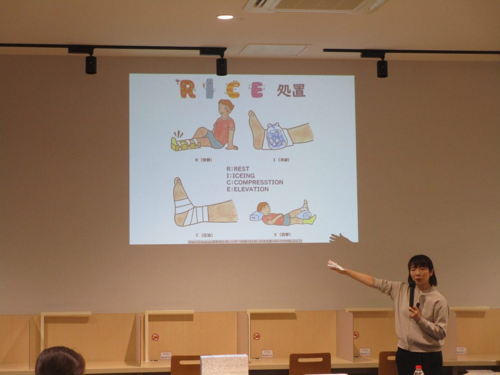 講師に清水真由美氏(弘前大学教育学部教育保健講座 助教)をお招きし、ケガ、やけど、骨折、脱臼、熱中症等の応急処置について、処置の根拠を学んでもらい、その根拠に基づいて考えながら実践しました。